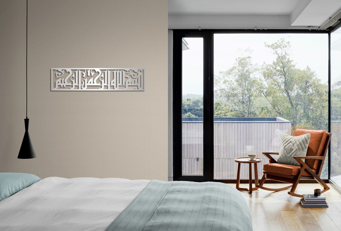الجوهر الروحي: يجسد العبارة الإسلامية "بسم الله الرحمن الرحيم" داعياً إلى بركات الله تعالى في تصميم خطي أنيق.