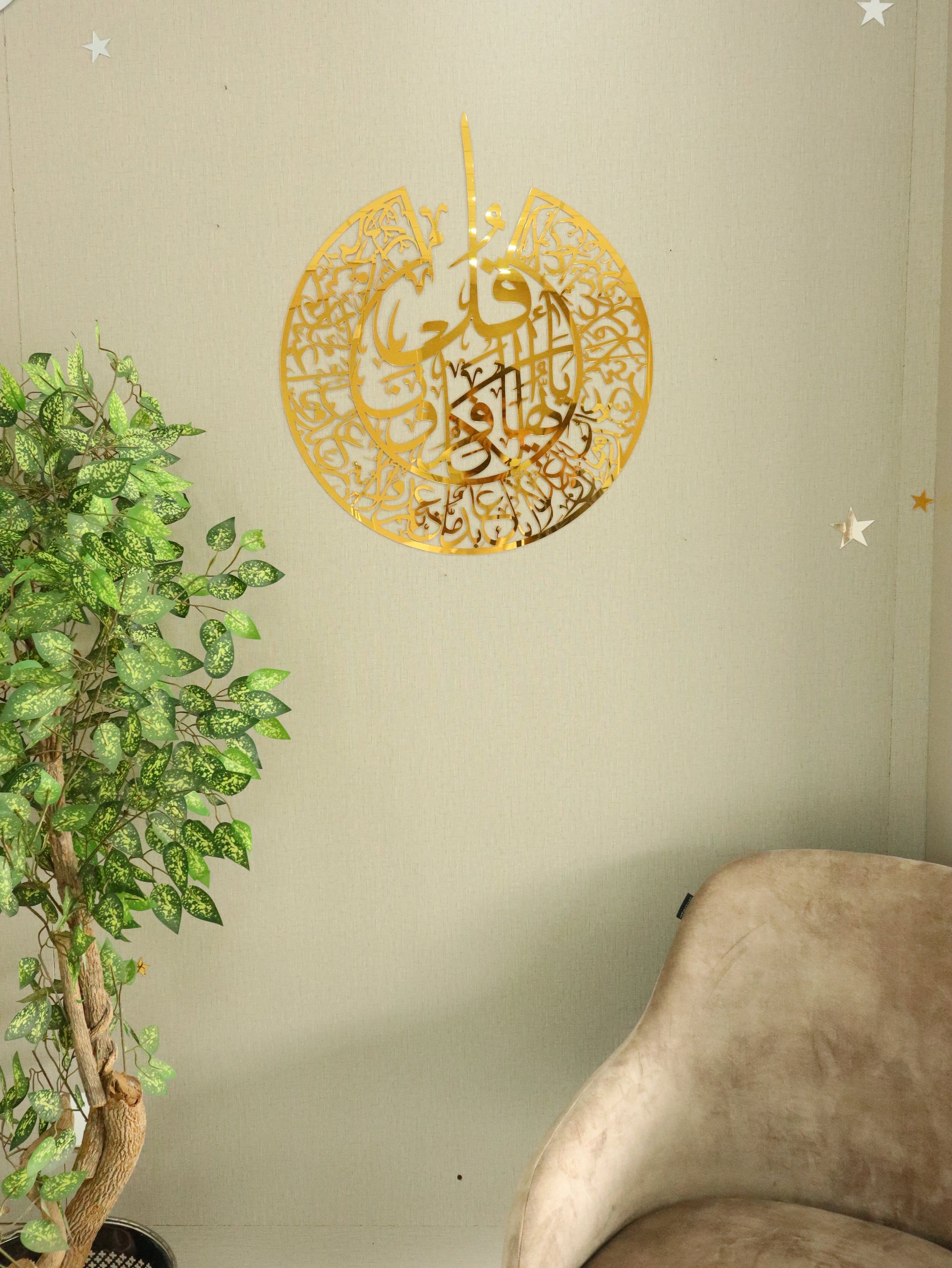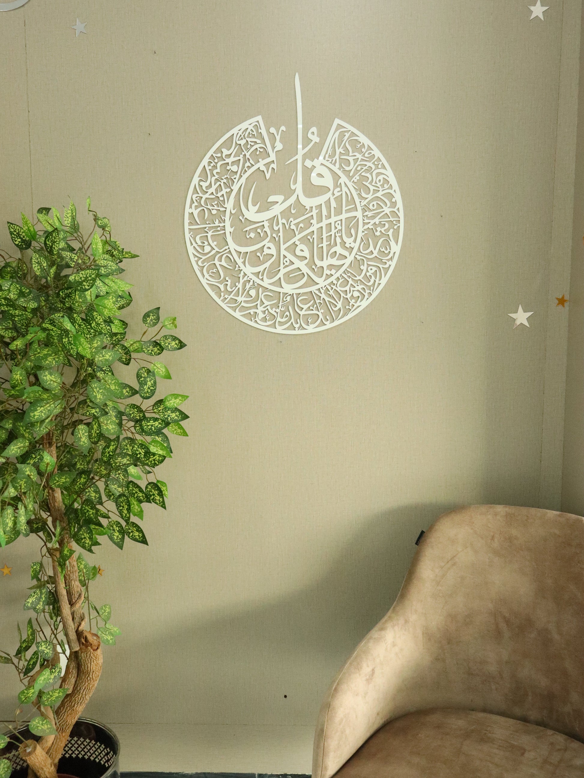 لوحة فنية إسلامية جدارية من الأكريليك تحمل سورة الكافرون هي قطعة مذهلة بصريًا مصنوعة على قماش أكريليك عالي الجودة. تتميز هذه اللوحة الفنية الجدارية العصرية والأنيقة بالخط العربي الأنيق لسورة الكافرون من القرآن الكريم، وتضفي لمسة من الرقي على مساحتك بينما تعمل كمصدر للإلهام الروحي. تبرز الأكريليك الشفاف التفاصيل المعقدة، مما يجعلها إضافة خالدة وذات مغزى لمنزلك أو هدية مدروسة لأحد أحبائك.