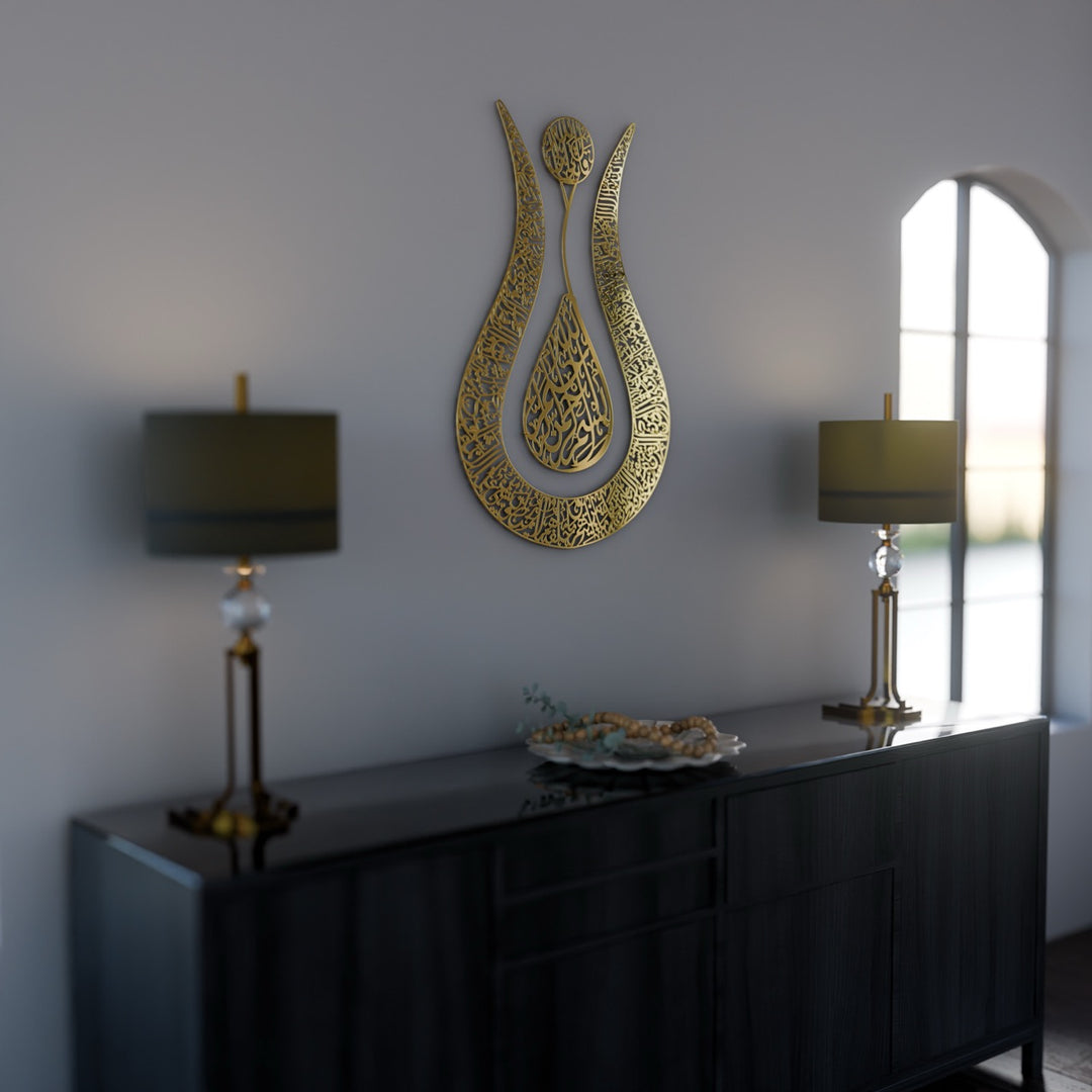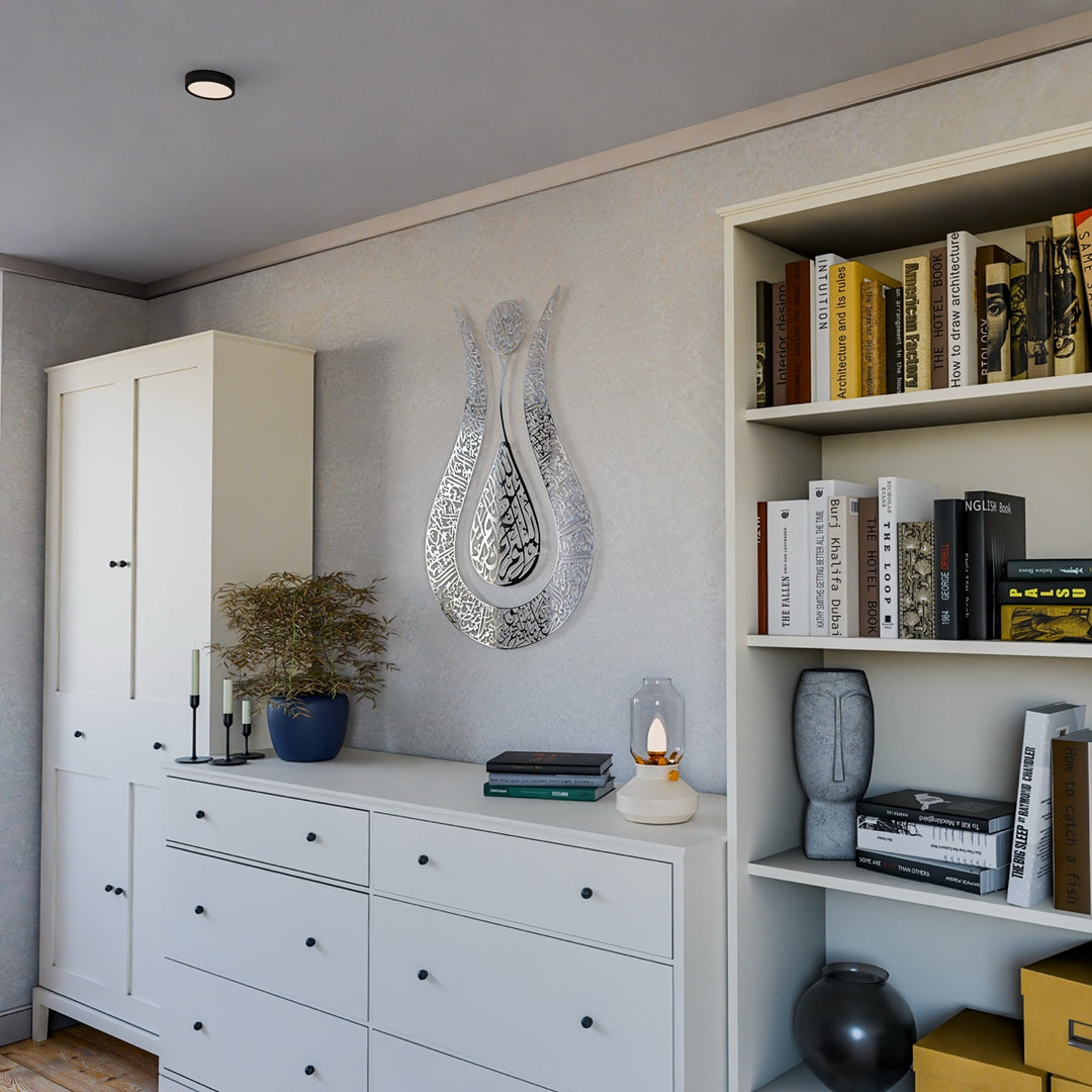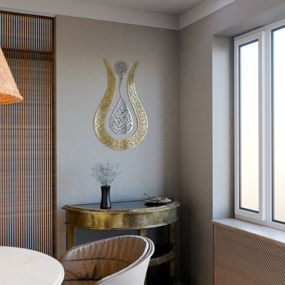 زين مساحة معيشتك بفن الحائط الإسلامي بخط آية الكرسي، المصنوع على شكل زهرة توليب فريدة من نوعها مع أكريليك لامع. هذه القطعة هي شهادة على الفن الإسلامي ومثالية للديكور المنزلي الإسلامي. هذا الفن الجداري الفريد بخط آية الكرسي مثالي أيضًا لجدرانك. مثالي لغرف المعيشة، فهو بمثابة هدية إسلامية رائعة للمناسبات الخاصة مثل رمضان، حيث يمزج بين العمق الروحي والتصميم الحديث لرفع أجواء أي منزل.