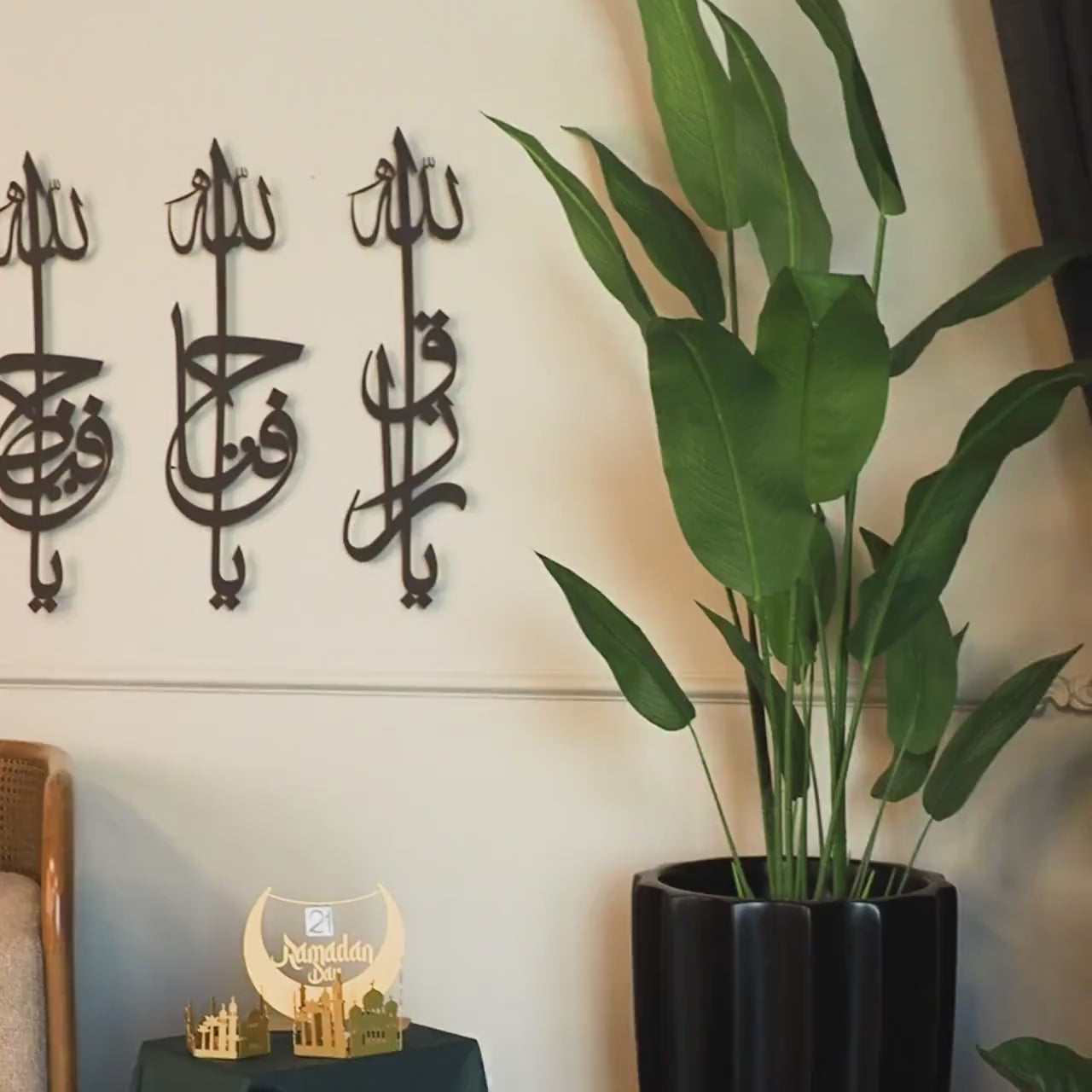 عزز جمال منزلك أو مكتبك بهذه المجموعة الأنيقة المكونة من 3 قطع فنية جدارية إسلامية، تتميز كل منها بعبارة قوية للذكرى: يا شفيع يا حفيظ يا رزاق يا فتاح . مصنوعة من مزيج من الأكريليك عالي الجودة واللوح الليفي متوسط الكثافة، توفر هذه القطع جمالية حديثة وخالدة تكمل أي مساحة.